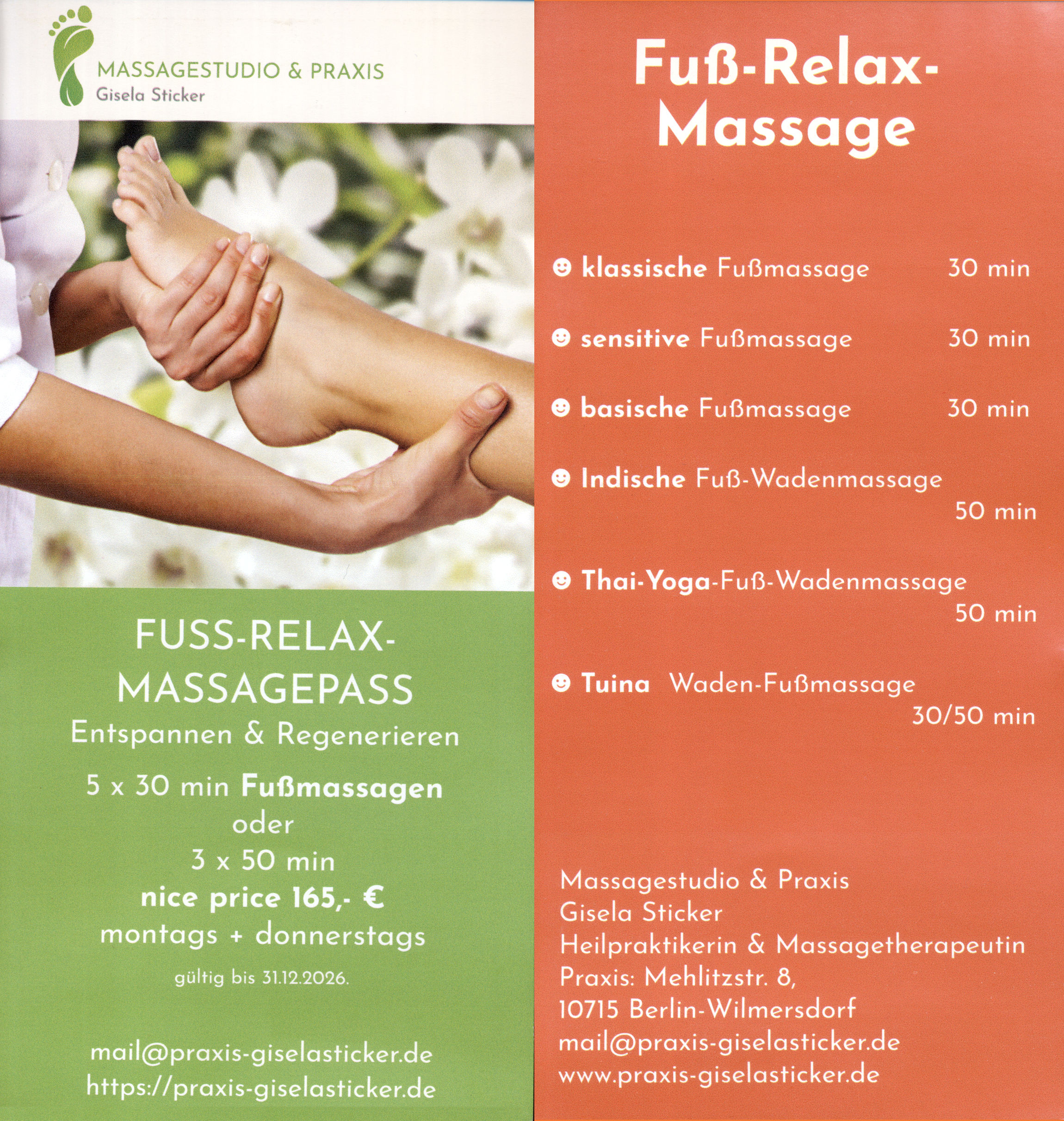 | Fußreflexzonenmassage | 50 min | 55,- € |